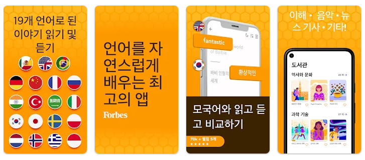 Beelinguapp은 영어와 모국어를 동시에 보여주는 오디오북 형식의 앱입니다. 문학 작품, 기사, 동화 등 다양한 콘텐츠를 통해 자연스럽게 영어를 익힐 수 있습니다.