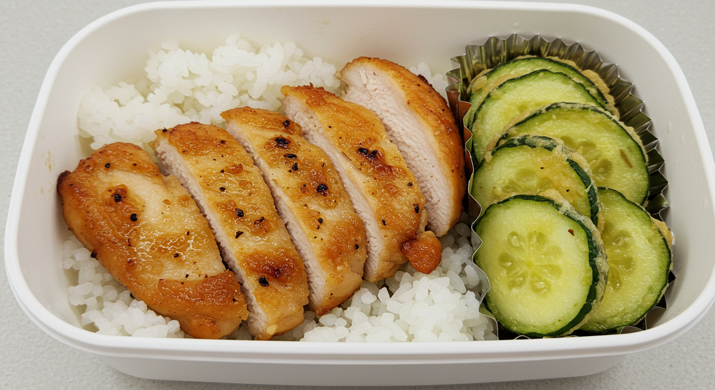 닭가슴살과 오이를 간장 베이스로 볶아 담백하면서도 고소한 도시락. 칼로리는 낮고 포만감은 높아 다이어트 중인 직장인에게도 딱 좋습니다.