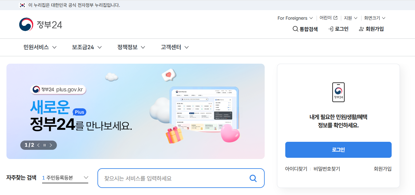 정부24 사이트는 www.gov.kr에서 이용하실 수 있으며, 모바일에서는 ‘정부24’ 앱을 통해 동일한 기능을 사용할 수 있습니다. 다만, 모바일에서는 일부 기능이 제한되거나 공동인증서 설정이 필요한 경우가 있어 PC 사용을 추천드립니다.